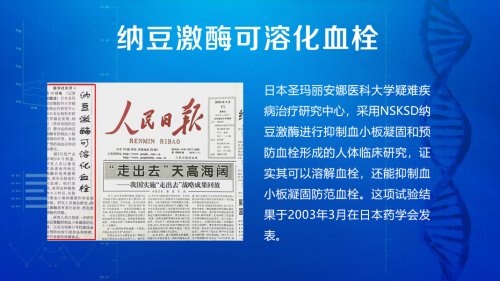 2003年日本圣玛丽安娜医科大学开展的《纳豆激酶抑制血小板凝固和预防血栓形成临床试验》,发现纳豆激酶不但能溶解血栓,还能抑制血小板凝固,起到预防血栓形成的作用。当年《人民日报》曾以《纳豆激酶可溶化血栓》为题报道。