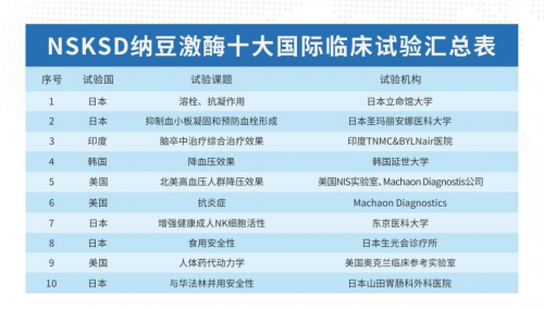 ▲ NSKSD纳豆激酶十项国际临床试验|日生研生命科学(浙江)有限公司收集、提供